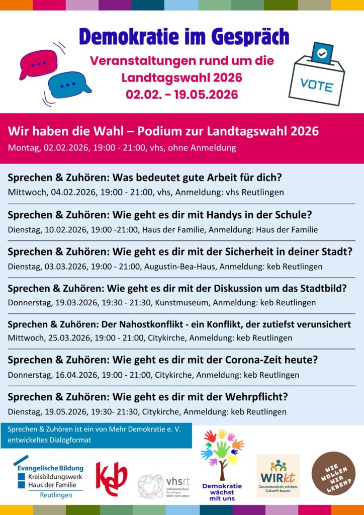 Vom 02.02. bis 19.05.2026 laden wir im Rahmen der Landtagswahl 2026 zu verschiedenen Veranstaltungen ein, die demokratische Themen aufgreifen und zum Austausch anregen. In Podien und offenen Gesprächsformaten geht es um Fragen, die viele Menschen bewegen – von Wahlentscheidungen über Arbeit, Schule und Sicherheit bis hin zu gesellschaftlichen Konflikten. Ziel ist es, zuzuhören, unterschiedliche Perspektiven kennenzulernen und Demokratie im Gespräch lebendig werden zu lassen.